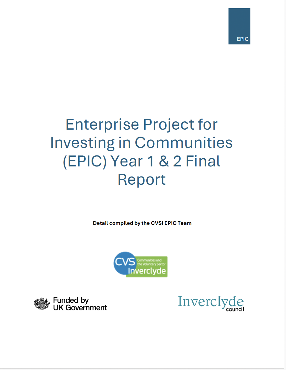 Publications and Reports Inverclyde Strategic Plan 2026-2029 Read now Third Sector Equality and Human Rights Impact Assessment Read now Enterprise Project for Investing in Communities (EPIC) Year 1 and 2 Report Read now Rural Volunteering Survey Report Read now